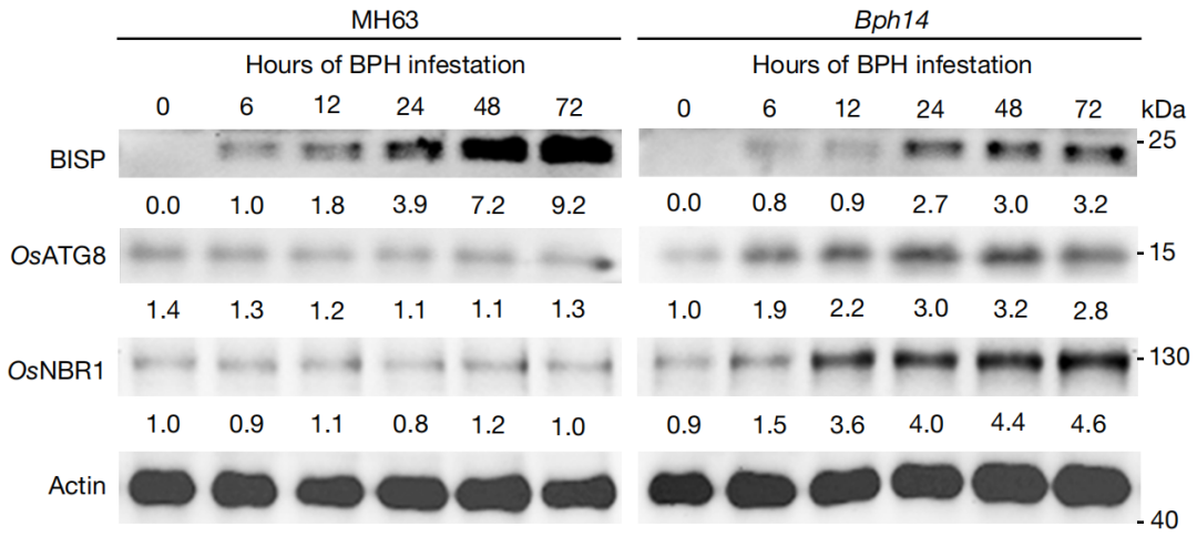 图10 Bph14和MH63植物中BISP、OsATG8和OsNBR1的免疫印迹检测(Guo et al., 2023)。
