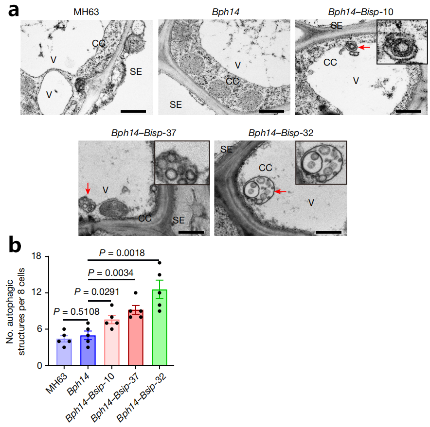 此外,通过透射电镜,作者观察到与Bph14和MH63植物相比,未感染的Bph14-Bisp植物韧皮部伴侣细胞中有更多的双膜自噬小体结构(图8a,b)。因此,OsATG8蛋白和OsATG8a、OsATG8b和OsATG8c转录本在未感染的Bph14-Bisp植物中显著高于Bph14和MH63植物中的蛋白。这些观察结果表明,BISP通过BPH14依赖的方式降解。