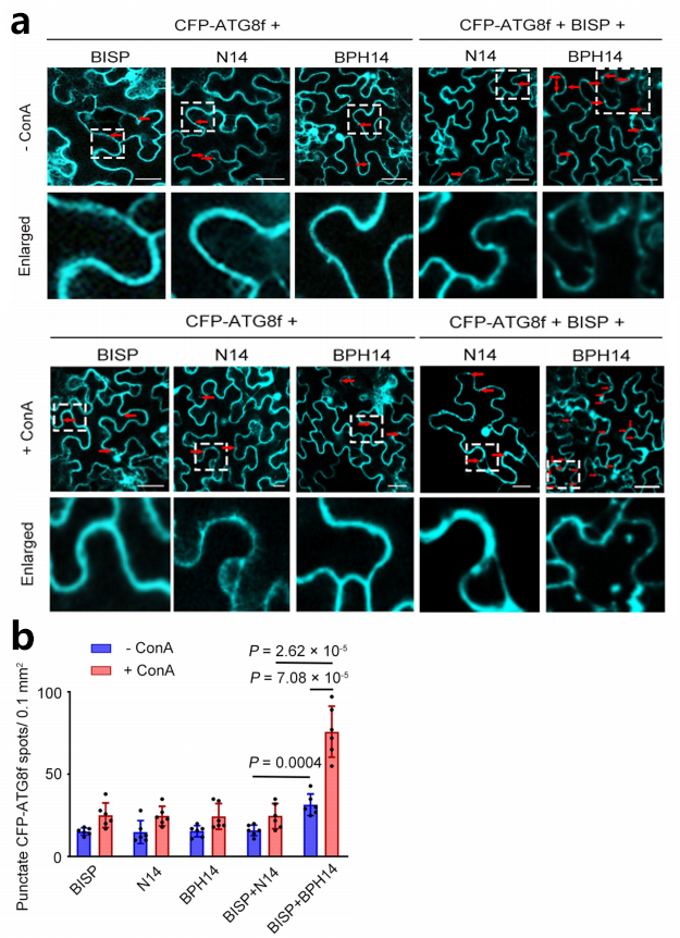 图6 (a)(上)在ConA缺失(上图)或存在(下图)时CFP-ATG8F标记的自噬点结构的共聚焦图像。研究结果显示,经农杆菌侵染烟草叶片后,CFP-ATG8f与BISP、N14或BPH14共表达,以及CFP-ATG8f和BISP与N14或BPH14共表达时细胞中的自噬小体。红色箭头表示CFP-ATG8f标记的自噬点。(下)显示放大后的自噬小体图像;(b)在存在或不存在ConA的情况下,CFP-NbATG8标记的自噬点的平均数量(Guo et al., 2023)。