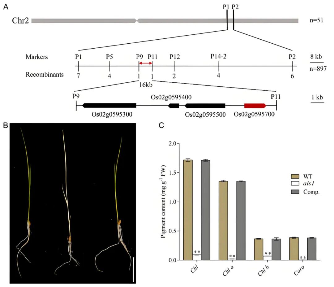 图5 ALS1的分子克隆(Xu et al., 2024)。(A)ALS1基因的图位克隆;(B、C)野生型(左)、als1突变体(中)和互补系(右)的幼苗表型(B)、叶绿素含量(C)。