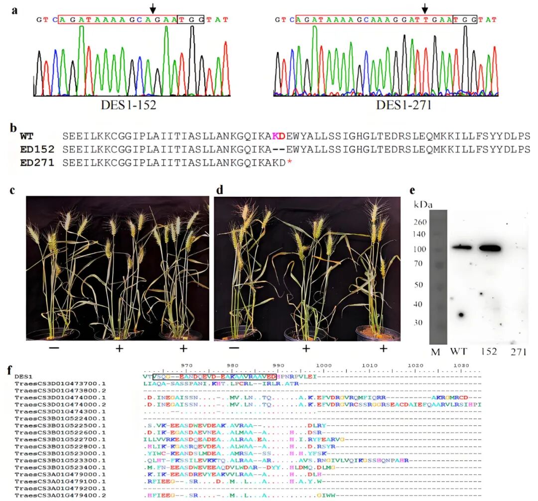 作者在研究E3基因的RNAi转基因小麦后代中,偶然发现了一株在幼苗阶段自发坏死的突变体,其表型与E3-RNAi无关,推测是转化或组培过程中产生的新突变。遗传分析表明,该坏死表型由半显性基因控制,杂合子表现为半致死性(个体在生长发育过程中,仅有部分个体存活,部分个体死亡的表型),纯合子在10-14天内死亡,符合1:2:1的分离比(图6a)。通过图位克隆技术,将目的基因定位在3DL染色体59.24kb区域,最终确定候选基因为TraesCS3D01G474300(命名为DES1)。序列分析显示,mDES1相较于野生型DES1发生G→A单核苷酸突变,导致441位氨基酸由天冬氨酸(Asp)突变为天冬酰胺(Asn)(图6b-h)。