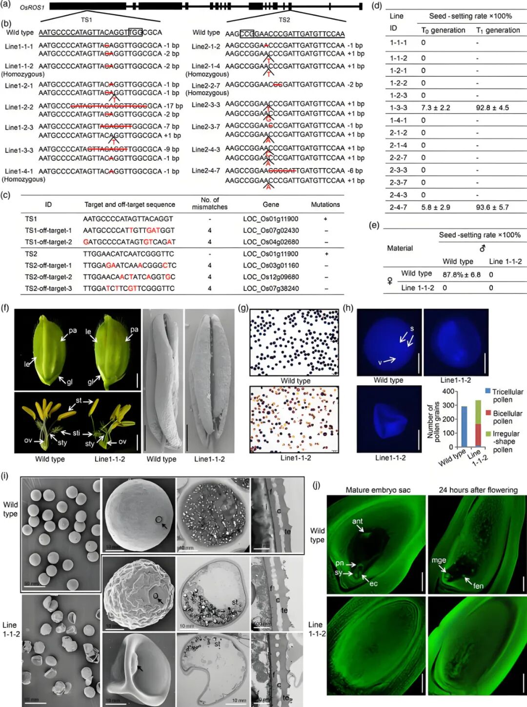 Xu Y, Wang F, Chen Z, et al. CRISPR/Cas9‐targeted mutagenesis of the OsROS1 gene induces pollen and embryo sac defects in rice[J]. Plant Biotechnology Journal, 2020, 18(10): 1999.