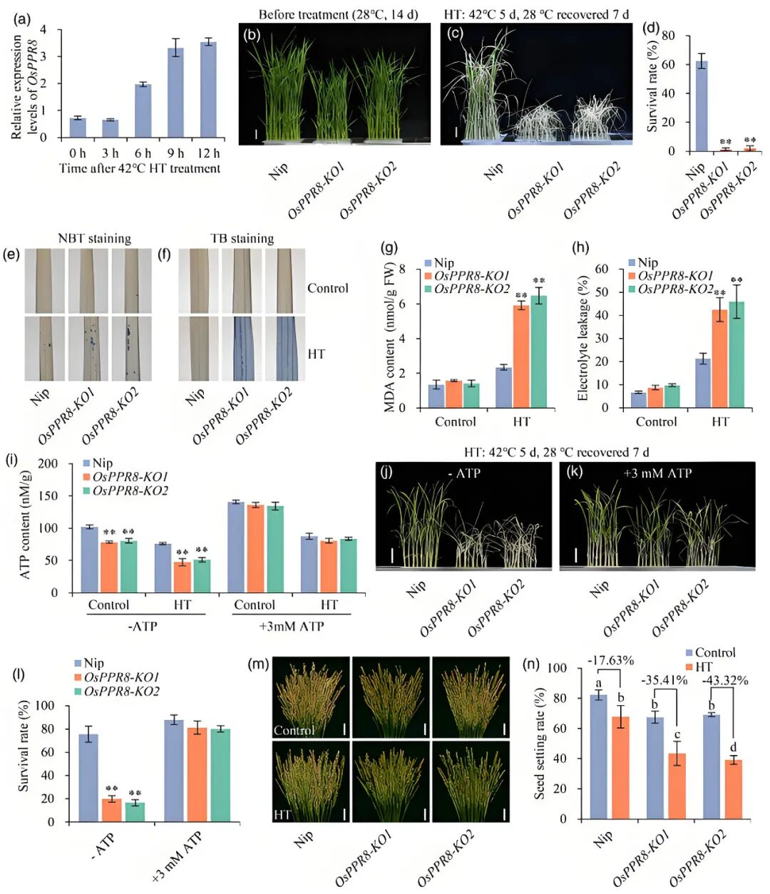 图10 OsPPR8在高温耐受性中起着重要作用(Yuan et al., 2025)。(a)高温诱导下OsPPR8的表达水平;(b-h)高温处理前后,对Nip和OsPPR8-KO幼苗的表型(b、c)、幼苗的存活率(d)、NBT染色(e)、TB染色(f)、MDA含量(g)、电解质渗漏(h)进行分析;(i-l)对照和高温处理下,有无外源ATP处理,Nip和OsPPR8-KO幼苗的ATP含量(i)、幼苗表型(j、k)、幼苗的存活率(l);(m、n)高温处理前后Nip和OsPPR8-KO穗的表型(m)、结实率(n)。