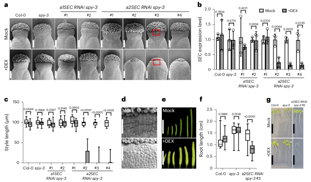 拟南芥中两种O-糖基转移酶SECRET AGENT (SEC)和SPINDLY (SPY)的双突变会导致胚胎在不同发育阶段死亡,无法获得存活的双突变体幼苗,而单一突变体可正常存活,表明这两种酶在植物发育中发挥协同且关键的作用(Hartweck et al., 2002;Hartweck et al., 2006)。由于SEC和SPY双突变引发的胚胎致死效应限制了对二者协同作用的研究,2024年1月,英国John Innes Centre细胞与发育生物学系Laila Moubayidin课题组在Nature Plants杂志上发表了一篇题为“O-glycosylation of the transcription factor SPATULA promotes style development in Arabidopsis”的研究论文,作者构建了地塞米松(DEX)诱导型SEC RNAi载体,以降低spy-3背景中的SEC mRNA水平,模拟SEC与SPY双酶活性缺失的胚后状态。作者设计了两个SEC基因特异性靶标序列(a1SEC、a2SEC)以降低脱靶概率,随后通过qRT-PCR技术检测转基因株系,发现仅含a2SEC靶标序列的株系在DEX处理后显著降低SEC转录水平(图2b)。DEX诱导后,SEC RNAi spy-3株系花柱长度显著缩短,花柱细胞伸长受阻,细胞分化标记(蜡质/褶皱结构)缺失(图2a、d);除花柱外,该株系的果实长度也出现缩短(图2e),幼苗的根变短(图2f),并且经过13天DEX处理后,幼苗生长停滞(图2g)。这一结果再次印证了SEC与SPY在植物不同发育阶段的协同调控作用。