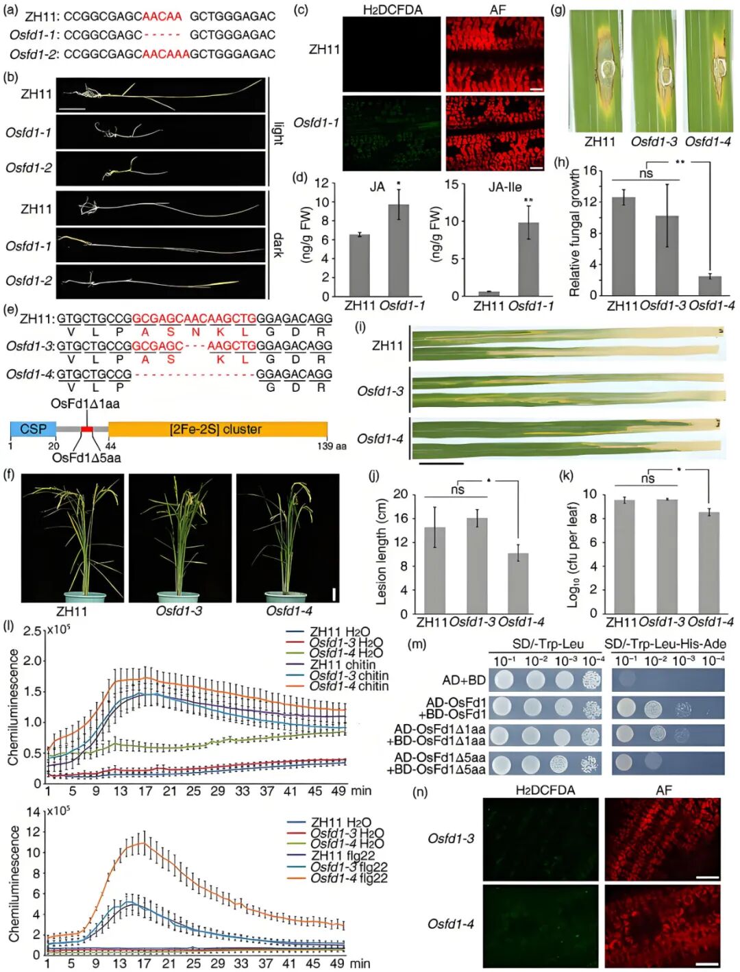 为解决完全敲除突变体的致死问题,作者通过进一步筛选CRISPR/Cas9编辑后代,获得Osfd1-3和Osfd1-4两个纯合弱等位突变体,其编码区分别存在3bp和15bp的缺失(图9e)。表型观察显示,这两个突变体均表现出与野生型类似的生长状态,且农艺性状无明显缺陷(图9f);抗病性检测发现,与ZH11和Osfd1-3相比,Osfd1-4对稻瘟病菌和白叶枯病菌的抗性显著增强,且几丁质和flg22诱导的ROS爆发也明显增强(图9g-l)。酵母双杂交实验显示,OsFd1具有较强的自结合能力,而OsFd1的5个氨基酸缺失会显著降低这种自结合能力(图9m),推测该缺失可能影响OsFd1的二聚化及电子传递效率。H2DCFDA染色结果也显示,Osfd1-4叶绿体中存在适量ROS积累,而Osfd1-3无此现象,表明这种适量ROS积累可能是Osfd1-4增强抗病性的关键因素之一(图9n)。