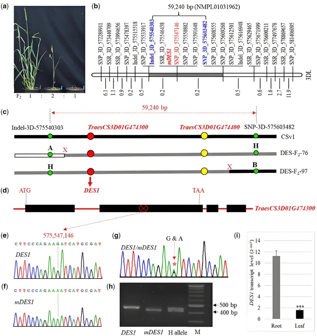 图6 mDES1的定位和克隆(Jia et al., 2021)。(a)Sumai3 mDES1×白小麦群体F2代植株的表型;(b)mDES1在3DL染色体上的遗传图谱;(c)mDES1两侧最近的两个标记Indel_3D_575540303和SNP_3D_575603482的物理距离,在两个侧翼标记之间的靶区域中鉴定出两个候选基因TraesCS3D01G474300和TraesCS3D01G474400;(d)TraesCS3D01G474300的基因结构;(e)纯合DES1等位基因的部分序列;(f)纯合mDES1等位基因的部分序列;(g)杂合DES1/mDES1等位基因的部分序列;(h)用于检测DES1和mDES1等位基因变异的诊断性PCR标记;(i)野生型Sumai3幼苗期根和叶中DES1的表达。