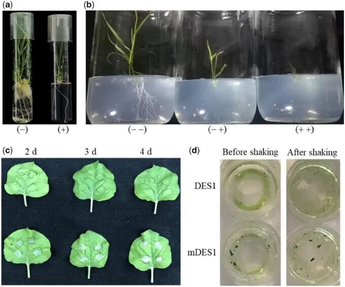 图7 DES1/mDES1在转基因小麦中的功能验证(Jia et al., 2021)。(a)在培养管中表达mDES1的转基因T0代小麦植株(mDES1-OE20);右侧为阳性转基因植株(+),左侧为非转基因植株(−);(b)在MS培养基中表达mDES1的转基因T1代小麦植株,左侧为野生型(−−),中间为杂合转基因植株(−+),右侧为纯合转基因植株(++);(c)使用表达DES1和mDES1的农杆菌侵染烟草叶片,分别在侵染后2、3和4天对代表性叶片进行拍照;(d)将DES1和mDES1构建体转化到烟草原生质体中,将原生质体悬浮于孔板中,在黑暗条件下培养24小时后进行成像。