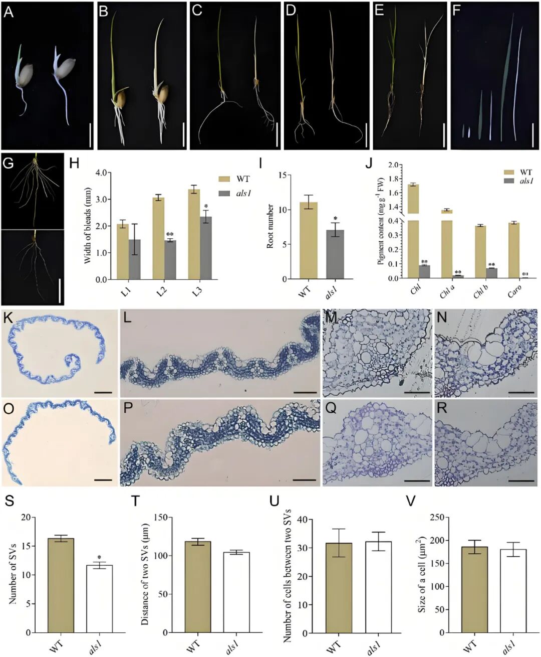 2023年11月,广西大学覃宝祥课题组在Plant Science杂志上发表了一篇题为“Disruption of the rice ALS1 localized in chloroplast causes seedling-lethal albino phenotype”的研究论文,作者鉴定并表征了一种具有幼苗白化致死性表型的水稻突变体als1,该突变体在芽期出现白化表型,在单叶至三叶期表现出显著的白化特征并逐渐停止生长最终死亡(图3A-F)。与野生型相比,als1突变体中总叶绿素、叶绿素a(Chla)、叶绿素b(Chlb)和类胡萝卜素的含量均较低(图3J)。此外,als1突变体的冠根数、第二叶和第三叶宽度均显著减少(图3G-I),并且als1突变体叶片变窄主要是由于小维管束数量减少所致(图3K-V)。