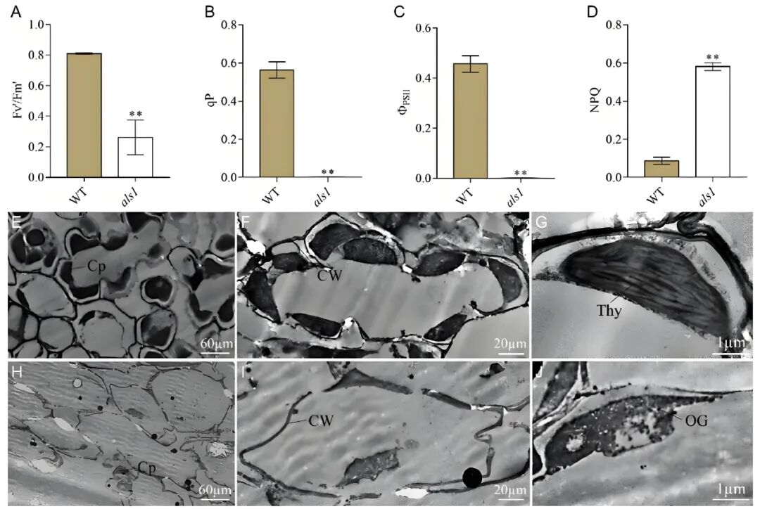 图4 野生型和als1突变体叶片的叶绿素荧光参数及透射电镜(TEM)观察结果(Xu et al., 2024)。(A-D)比较野生型和als1突变体中叶绿素荧光参数的Fv'/Fm'、qP、ΦPSII和NPQ值;(E-G)野生型叶片的细胞结构;(H-J)als1突变体叶片的细胞结构;Cp为叶绿体;CW为细胞壁;OG为嗜锇颗粒;Thy为类囊体。