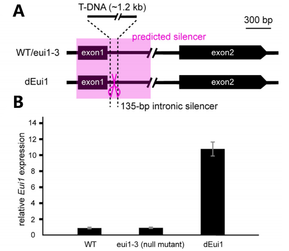图10 验证类沉默子通过染色质相互作用能够抑制远端基因(Ouyang et al., 2023 )。(A) 与野生型和无效突变体eui1-3相比,在dEui1中,T-DNA的插入导致预测沉默子的153bp区域发生了缺失突变。虚线截取区域表示1.2kb的T-DNA取代了135bp长的沉默子序列;(B) Eui1在野生型、eui1-3和dEui1中的相对表达水平。