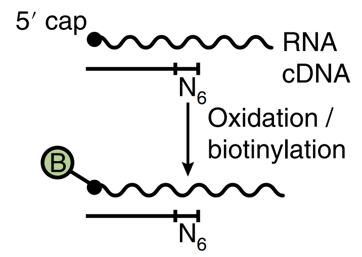 CAGE是一种鉴定TSS和基因表达水平检测的技术。CAGE技术的主要原理是对mRNA 5’端“帽子”加上生物素(图1),利用链霉亲和素对生物素进行捕获,从而捕获带有“帽子”的mRNA,然后将其反转录出5’端完整的cDNA,再通过对cDNA的高通量测序,在全基因组范围内检测出TSS和基因转录情况。CAGE技术能够作为微阵列芯片和RNA-seq的替代品(Adiconis et al., 2018)。