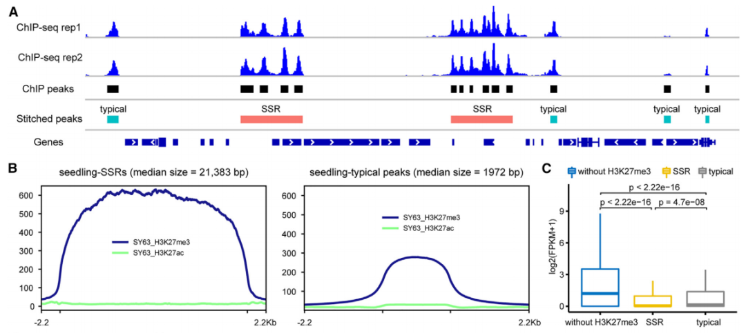 图8 全基因组范围内鉴定SSR和TSR(Ouyang et al., 2023 )。(A)代表性SSR和TSR的基因组图谱;(B)SSR和TSR信号峰宽度和强度的比较;(C)非H3K27me3关联基因、SSR关联基因、TSR关联基因表达水平的比较。