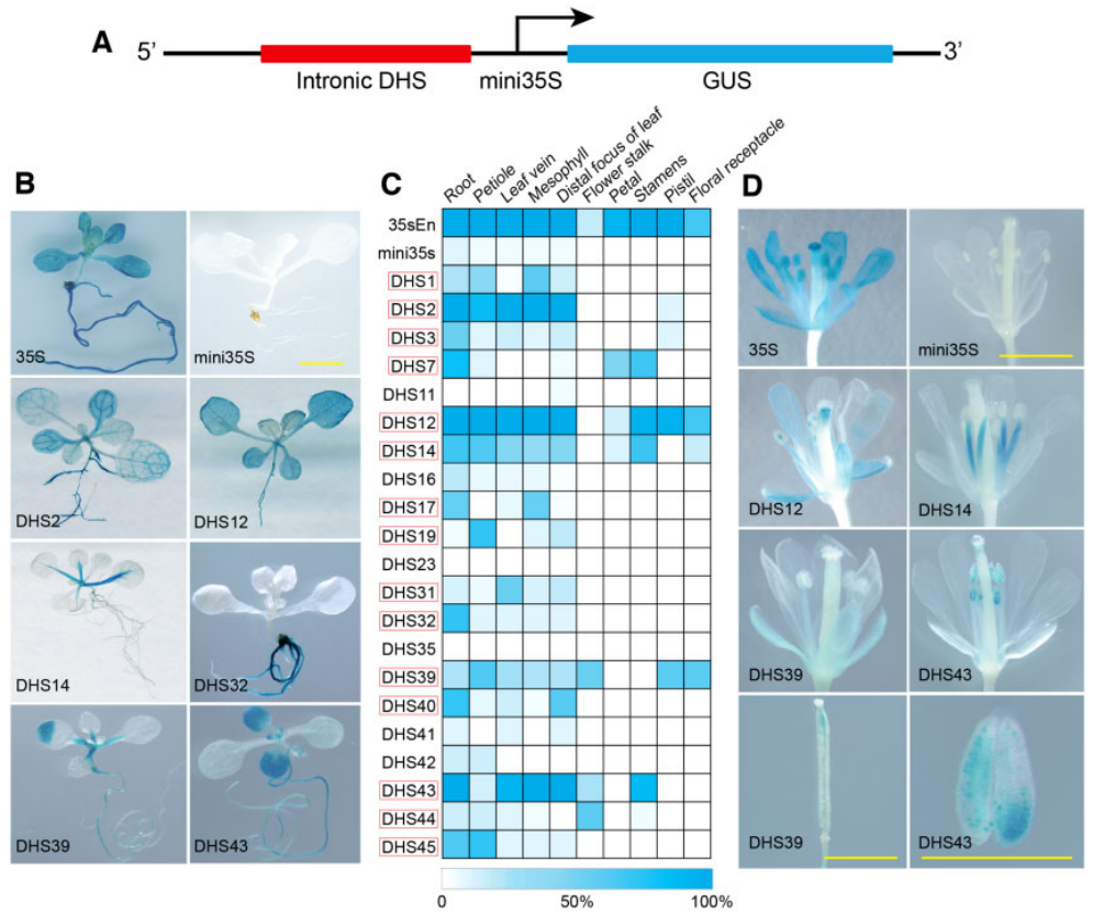 研究者使用了一种基于GUS报告基因的系统来对21个内含子型DHS进行功能验证。这种GUS报告基因系统是指将DHS序列融合mini 35S启动子和GUS报告基因的载体(图5A),并使用仅具有mini 35S启动子和全长35S启动基因的载体分别用作阴性和阳性对照,进行遗传转化获得转基因株系。每个DHS载体获得了14–31个独立的转基因株系,在每个转基因株系的不同发育阶段进行GUS测定,只有当超过50%的转基因株系在相同组织中显示出一致的GUS表达信号时,DHS才被认为具有增强子功能。实验结果显示,预测的21个内含子DHS中有15个(71%)被证实为具有增强子功能。