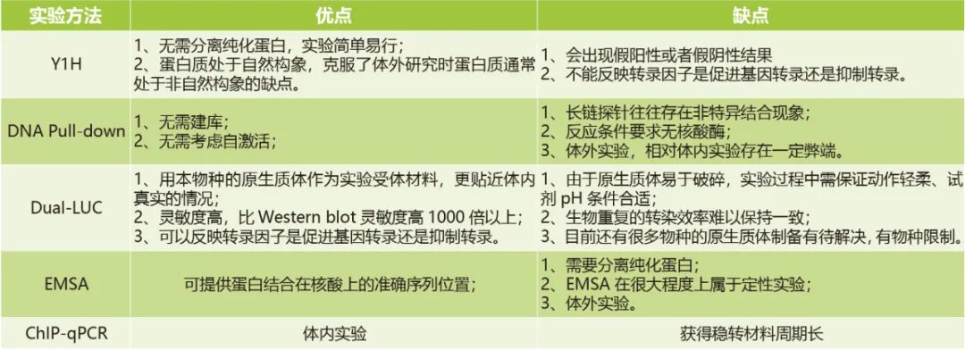 验证目的蛋白和下游调控基因的启动子序列相互作用时,一般需3种或3种以上的方法同时进行证明,遵循体内实验与体外实验相结合的原则。点对点验证实验方法的优缺点如下: