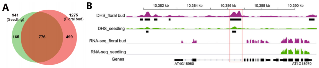 图4 对拟南芥内含子型DHSs的分析(Meng et al., 2021)。(A)在幼苗组织和花组织中鉴定的内含子DHSs的维恩图(Venn diagram);(B)在AGAMOUS基因(AG;AT4G18960)的第二内含子中发现了DHS。该内含子DHS调节AG表达的功能在先前的研究中已经得到证实,具有增强子功能。黑色长框代表DHS区域。峰高度表示DNase-seq读取reads的富集程度。红框中是包括DHS的内含子区域。