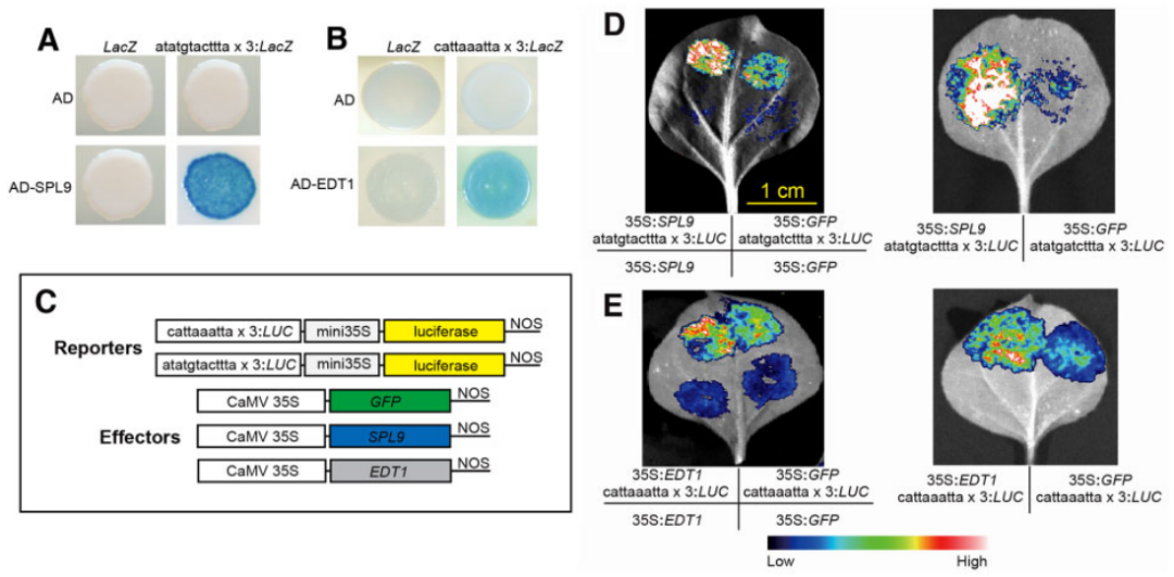 图7 对DHS7#1和DHS7#2增强子中预测的与SPL9和EDT1结合motif进行验证(Meng et al., 2021)。(A)在酵母单杂实验(Y1H)中,SPL9能够与DHS7#1增强子中“atatgtacttta”序列结合,并且强烈激活LacZ转录;(B)EDT1能够与DHS7#2增强子中“cattaaatta”序列结合,并且适度激活LacZ转录;(C)双荧光素酶报告基因检测实验(Dual-LUC)载体的示意图;(D)和(E)通过Dual-LUC验证得到的结论与酵母单杂结果一致。