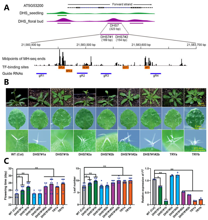 DHS7位于MYB相关转录因子TRIPTYCHON(TRY)基因的第二个内含子中,TRY促进根毛的形成,抑制叶苗的形成,并参与调控拟南芥开花过程。高分辨率的微球菌核酶测序(MNase-seq)显示,DHS7是由DHS7#1和DHS7#2组成的复合型增强子。GUS报告基因系统的结果显示,DHS7#1只在花中激活GUS的表达,而DHS7#2在叶片和根中激活GUS的表达。