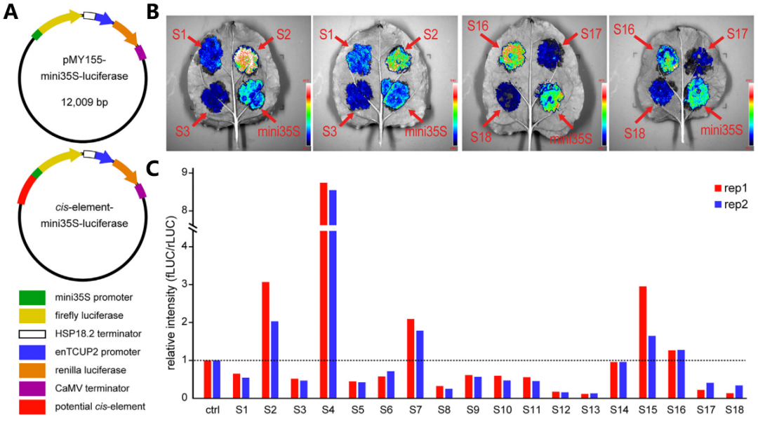 为了进一步验证类沉默子的转录抑制功能,研究者对18个类沉默子进行了双荧光素酶报告基因实验(Dual-LUC),具体是将这些元件构建到双荧光素酶报告载体pMY155中,然后将重组载体瞬时转染本氏烟草叶,仅携带mini 35S启动子的pMY155载体为阴性对照(图9A)。实验结果显示,18个类沉默子中有13个(72%)与35S启动子的对照相比,荧光素酶信号较低,表现出转录抑制活性(图9B、C)。这些结果进一步证实了H3K27me3关联的类沉默子的转录抑制功能。