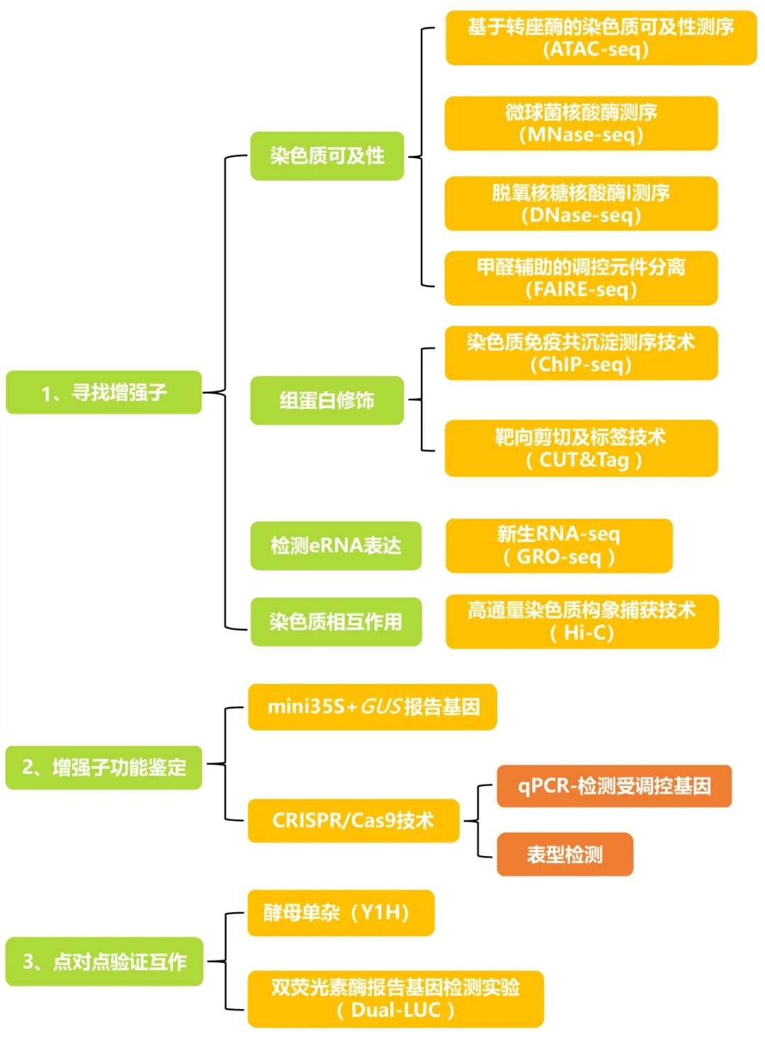 在动物中,增强子转录本(eRNA)的存在已被证明是活性增强子的标志, 在细胞中eRNA的丰度很低,同时容易被降解,需要比mRNA更灵敏的检测方法,如GRO-seq(Genome-wide nuclear run-on assays)技术。活性增强子通常位于可及性的染色质区域,该区域的基因组序列对核酸酶活性敏感,也称为DNase I超敏位点(DNase I hypersensitive sites,DHSs),DNase-seq技术就是利用DNase I来检测DHS的方法。