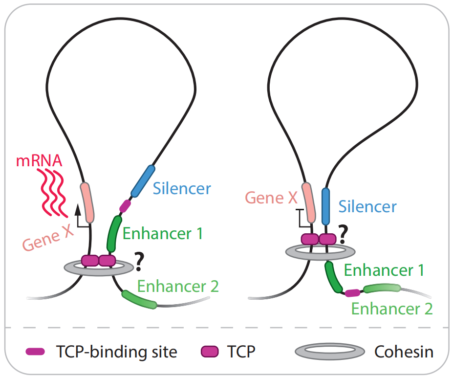 图11 CTCF-粘着蛋白结构域导致不同基因表达结果的示意图(Marand et al., 2023)。在植物中类似的染色质结构被预测是由TCP转录因子(多细胞动物中的CTCF)介导的。