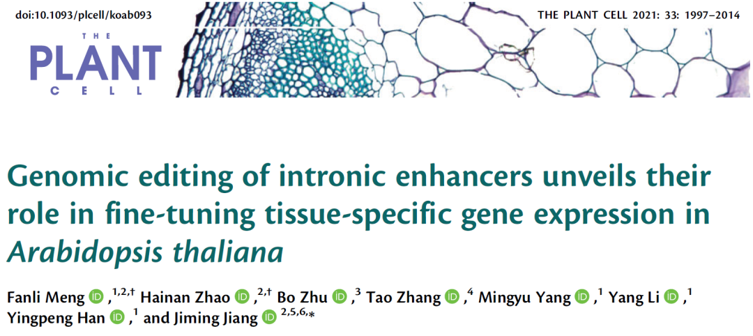 Meng F, Zhao H, Zhu B, et al. Genomic editing of intronic enhancers unveils their role in fine-tuning tissue-specific gene expression in Arabidopsis thaliana[J]. The Plant Cell, 2021, 33(6): 1997-2014.