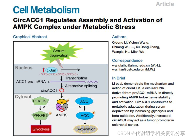 Biotree协助客户中国科学技术大学吴缅教授和安徽医科大学胡汪来教授及其研究团队在国际顶尖期刊《Cell Metabolism》上发表名为“CircACC1 Regulates Assembly and Activation of AMPK Complex under Metabolic Stress ”的研究成果。CircRNA+代谢组,如何研究才能发表在IF=22.415的顶级期刊上?下面小趣和大家一起学习下这篇文章的精彩之处。