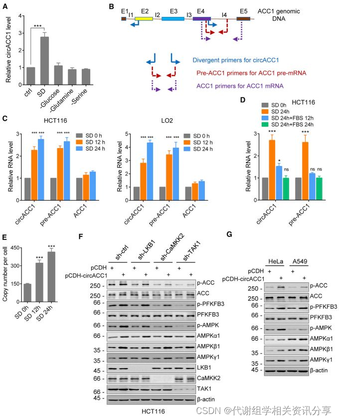 AMPK在维持能量平衡中起着非常重要的调控作用,可以感知和响应细胞能量和营养状态的变化。那么不同的应激条件是如何影响circACC1的表达呢?RT-PCR结果分析表明,血清饥饿状态能刺激circACC1的表达以及pre-ACC1的生成,但是对成熟circACC1 mRNA的表达水平并无影响。随后补充血清发现circACC1的水平也随之降低,说明circACC1 受到血清水平有效的调节。