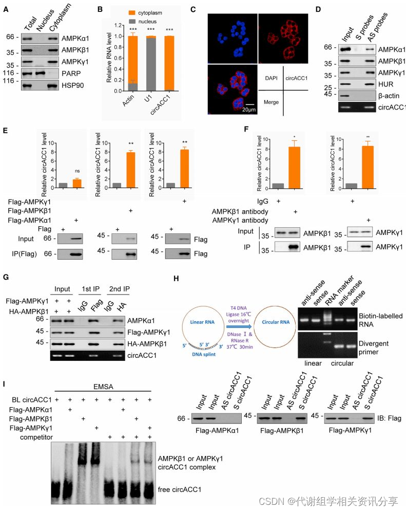 上述结果表明circACC1可以调控AMPK,那么它们是如何相互作用的呢?作者进行了进一步研究。FISH试验表明AMPK和circACC1都存在于细胞质中。Pull-down试验表明AMPK的每一个亚单位都可以用反义探针选择性地捕获。百趣代谢组学文献分享,RNA免疫沉淀(RIP)分析表明,circACC1与AMPK β1和γ1亚单位有很强的相互作用,但与ɑ1的结合很小。