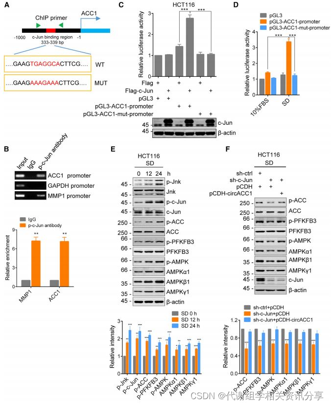 对ACC1的启动子进行分析,有CEBPA、c-Jun、CREB1和SREBF1结合位点,为了确定这些转录因子是否参与circACC1的调控,作者分别对这些转录因子进行敲除研究,发现只有c-Jun的沉默会显著降低circACC1的表达,表明c-Jun参与了circACC1的调控。百趣代谢组学文献分享,随后作者用CHIP试验和荧光素酶报告验证了c-Jun与ACC1启动子的结合。血清饥饿后诱导c-Jun激活,JNK和 AMPK信号增强,ACC1的水平降低。干涉c-Jun后AMPK和PFK2活性降低,超表达 circACC1后其活性恢复,这些研究表明c-Jun可促进circACC1的表达,增强AMPK活性。