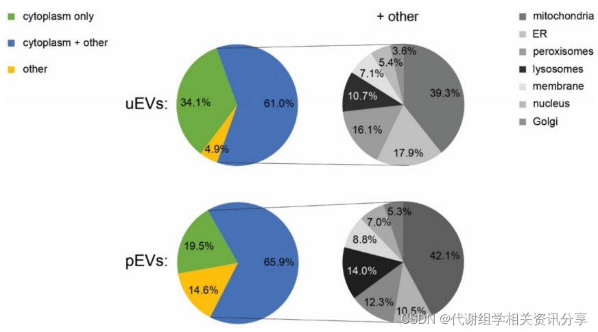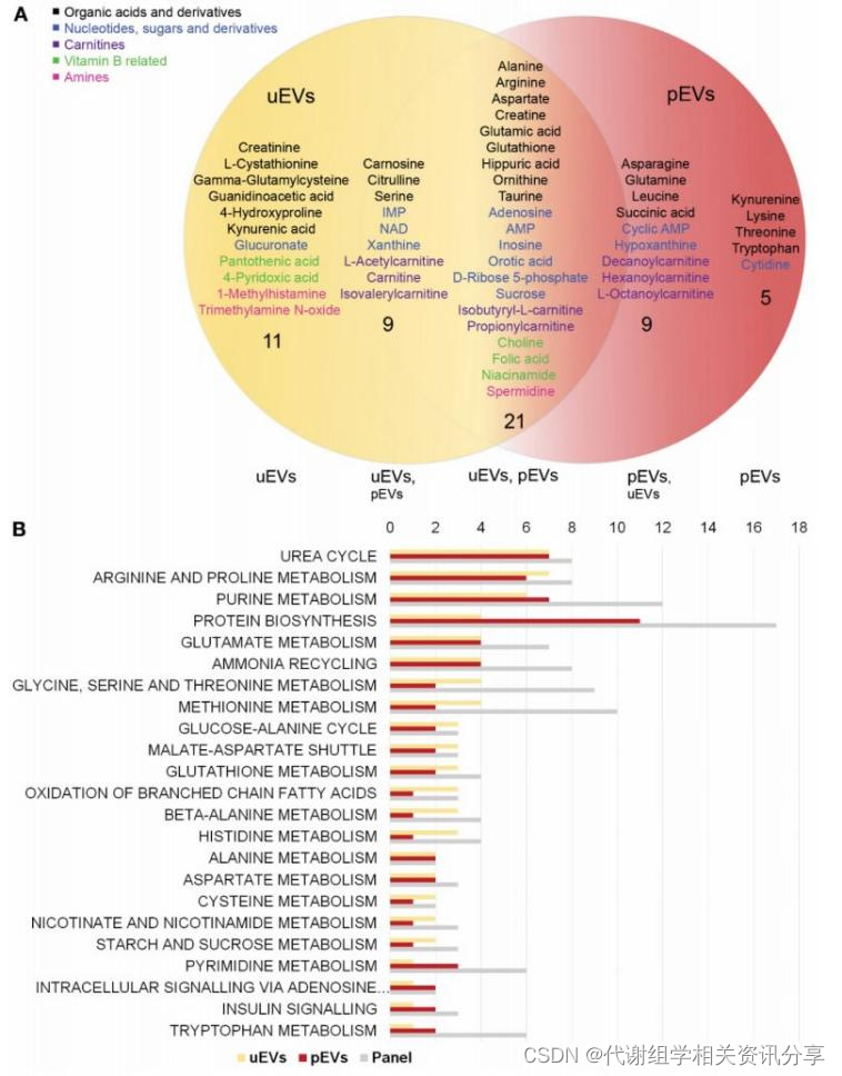 EVs中常见的代谢物可以分为五类:1)有机酸及其衍生物,2)核苷酸、糖和衍生物,3)肉碱,4)维生素B/相关代谢物,5)胺。分别分析了所有UEVs或PEVs中被定量的化合物,进行了代谢物富集分析,并使用代谢物摩尔质量除以EVs总体积以计算EVs中代谢物的浓度。代谢组学文献分享,结果表明:不同来源的EVs代谢谱具有相似性,但是也表现出明显的差异,EVs中含有能够富集到多种通路的物质,且其中某些物质具有较高浓度。