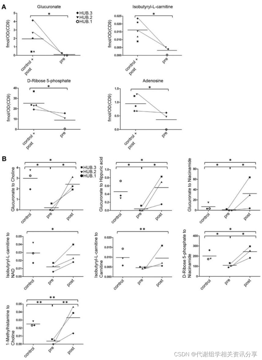 (A.将单个UEVs中代谢物浓度归一化为CD9的OD值;B. 两种代谢物之间的比率表明在前列腺切除术前的样本中代谢物的变化)