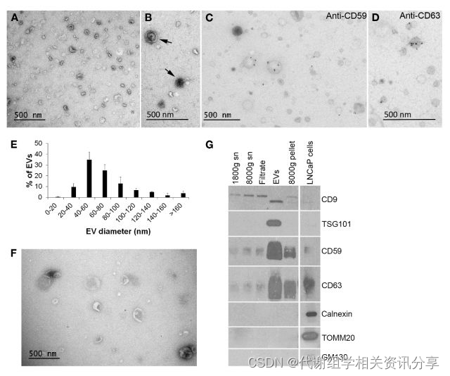 (A. EM显示UEVs典型的圆形形态和大小范围;B.偶尔见到多膜层的UEVs;C-D.EVs标志物CD59和CD63的免疫标记显示;E. EM图像中UEVs的大小分布表明;F. 经EM观察,血小板EVs(PEVs)具有典型的形态特征;G.UEVs分离的WB验证。)