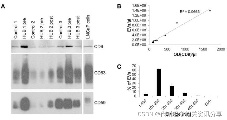 (A. 用EVs标记物对UEVs样本进行Western blotting;B. UEVs浓度的NTA分析;C.UEVs的尺寸分布)