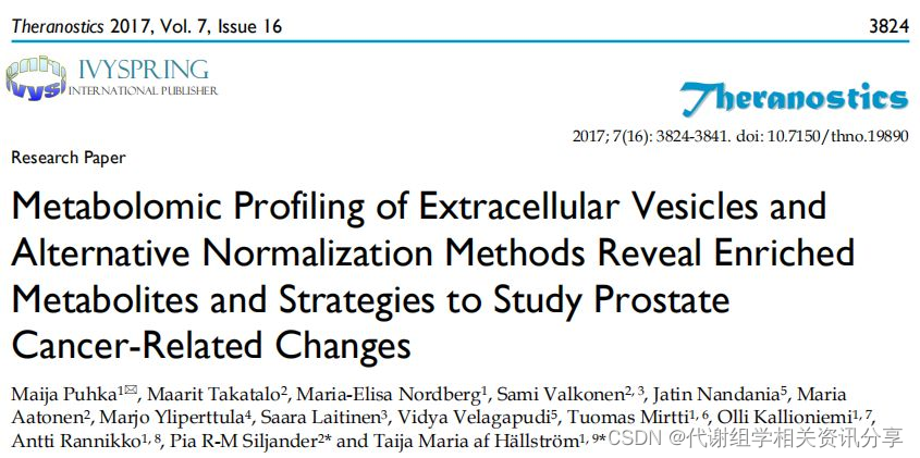 小小身体蕴含大大能量!前列腺癌非侵入性的诊断和监测的新方式——胞外囊泡(外泌体)代谢组学!目前,胞外囊泡/外泌体作为非侵入性的癌生物标志物已成为新的研究热点。百趣代谢组学文献分享,芬兰赫尔辛基大学学者Maija Puhka在期刊 Theranostics(IF=8.85)上发表了相关文章,下面我们一起来看看吧!