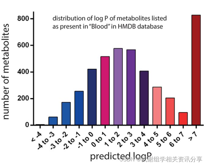 对HMDB里面的大约13000中物质按照极性进行分类,也就是给每个物质一个预测的log P值,结果显示log P小于5的有74%,也就是说极性大的物质比较多,因此做血清实验的时候,使用亲水的溶剂更好。百趣代谢组学文献分享,log P大于7的只占19%,表明使用亲水的复溶溶剂可能难以将这些物质检测出来。