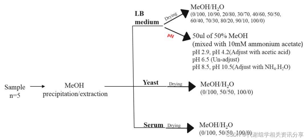 百趣代谢组学文献分享,首先,大神准备了三种样本,40例人血清(20例健康,20例疾病),LB培养基以及没有在正文结果中出现的酵母菌,用甲醇进行提取或者沉淀蛋白后干燥,再用不同比例以及不同pH的甲醇来进行复溶,最后用LC-qTOF进行检测。详情如下图:
