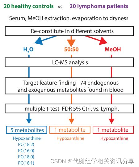 Figure 6. Work flow for metabolomics comparison of MeOH extracts of serum from 20 healthy control individuals and 20 lymphoma patients using three different reconstitution mixtures.