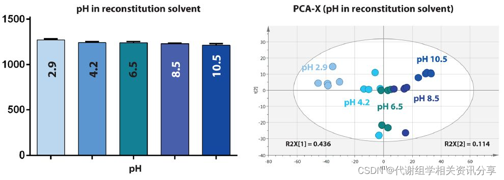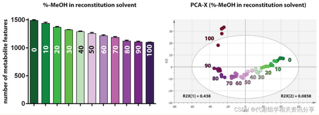 第一个图是色谱图的峰数量随甲醇比例的变化,第二个是根据定性出来的代谢物峰面积做了个PCA模型,果然,明晃晃的数据显示复溶试剂中甲醇的比例与代谢物的检测具有明显的关系,随着甲醇比例的升高,可以检测到的峰的数量在减少。