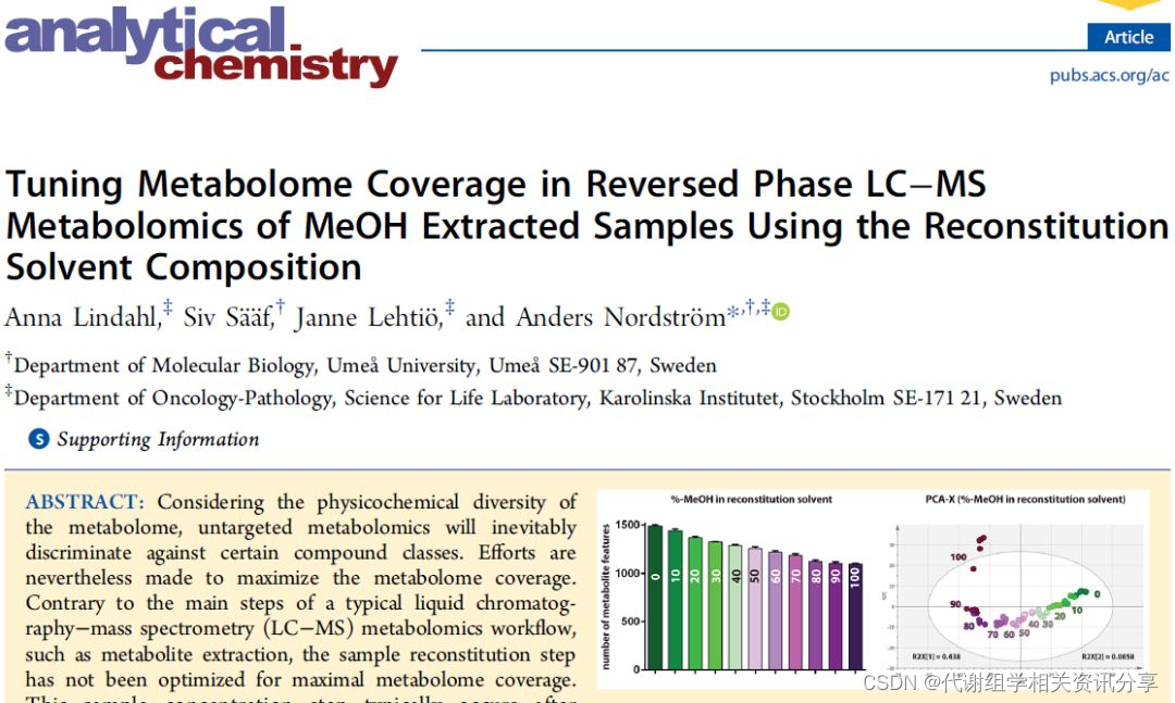 今天,BIOTREE 技术支持工程师Novenia 将和奋斗在实验室的小伙伴们分享一篇关于代谢组学实验过程中溶剂选择的文章Tuning Metabolome Coverage in Reversed Phase LC−MS Metabolomics of MeOH Extracted Samples Using the Reconstitution Solvent Composition。这是一篇2017年发表在analytical chemistry的文章,影响因子6.042。