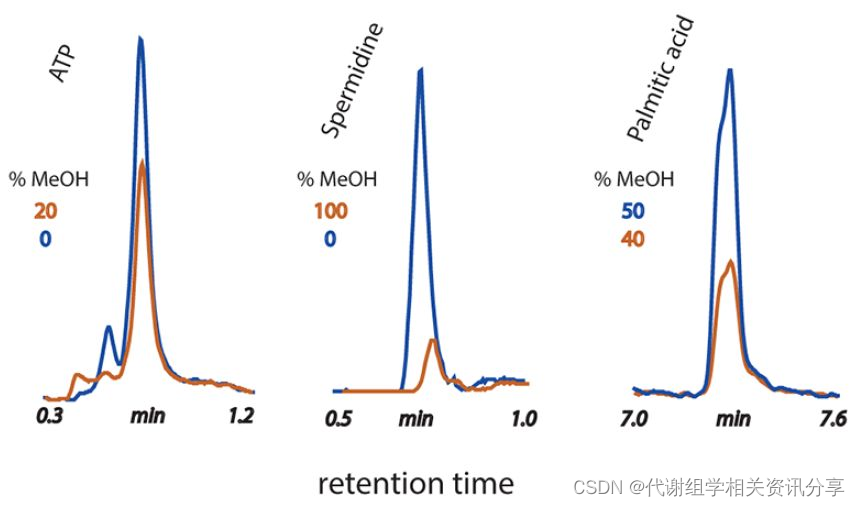 虽然不知道为什么,但是感觉很厉害的样子。结果发现log P小于5的物质的响应,如ATP、亚精胺都随着甲醇比例的减小而增加,而log P为7的棕榈酸则随着甲醇比例的减小而减小,由此可见复溶溶剂的极性与物质的极性是相关的。