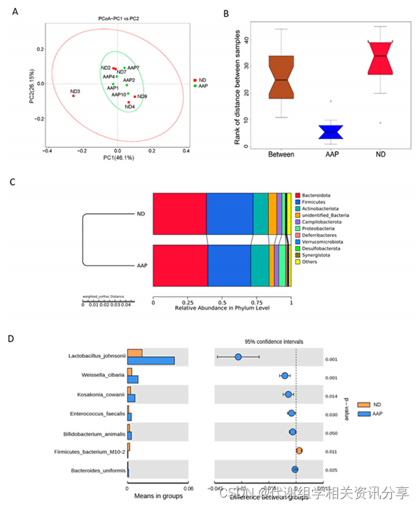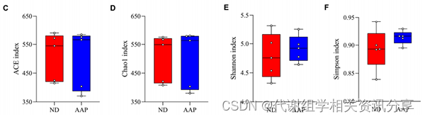 如图所示,ND组和AAP组的Chao1、ACE、Shannon和Simpson指数没有显著差异(图1C-F)。说明AAP喂食不会破坏小鼠肠道菌群的稳态。