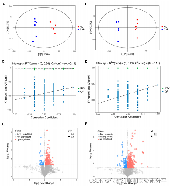 本次通过LC-MS检测到239种(负离子模式)和368种代谢物(正离子模式)。从OPLS-DA评分图可以看出,ND组和AAP组小鼠的血清样本有显著差异,且所有样本均在95%置信区间内。并通过置换检验验证了模型的可预测性及稳健性(图3A、B、C、D)。作者进一步结合VIP>1和p<0.05筛选出51种差异代谢物作为AAP喂食后小鼠血清中的潜在生物标志物。其中正负模式下都检测到L-赖氨酸、瓜氨酸和吲哚酚硫酸盐。