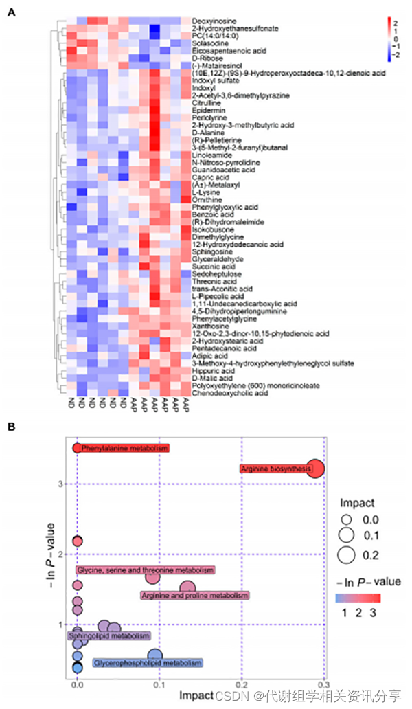 接下来作者对筛选的差异物质进行了层次聚类分析,进一步展示了这些物质在两组间的表达差异(图4A)。并通过对51种差异物质进行通路富集表明,AAP喂食后产生的差异物质主要富集在精氨酸生物合成途径中,其次是精氨酸和脯氨酸代谢,甘氨酸、丝氨酸和苏氨酸代谢,甘油磷脂代谢和鞘脂代谢途径(图4B)。