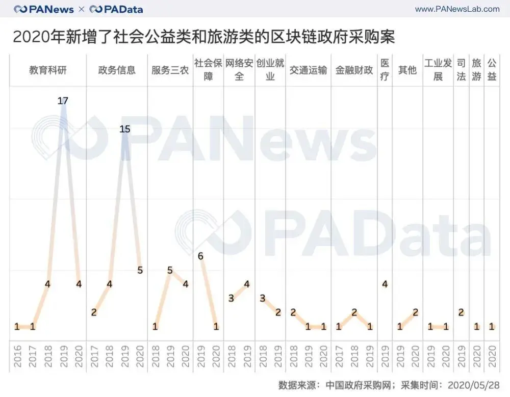 从时间线来看,教育科研类和政务信息类的采购案在2019年爆发式增长后迅速回落,而服务三农类的采购案预计将会增长,截至2020年5月,今年已有4个相关采购案公示,仅比2019年少1个。其他值得关注的领域还包括社会公益和旅游,这两类采购案是2020年新增的类别,分别由中国福利彩票发行管理中心和江苏省文化和旅游厅发起。