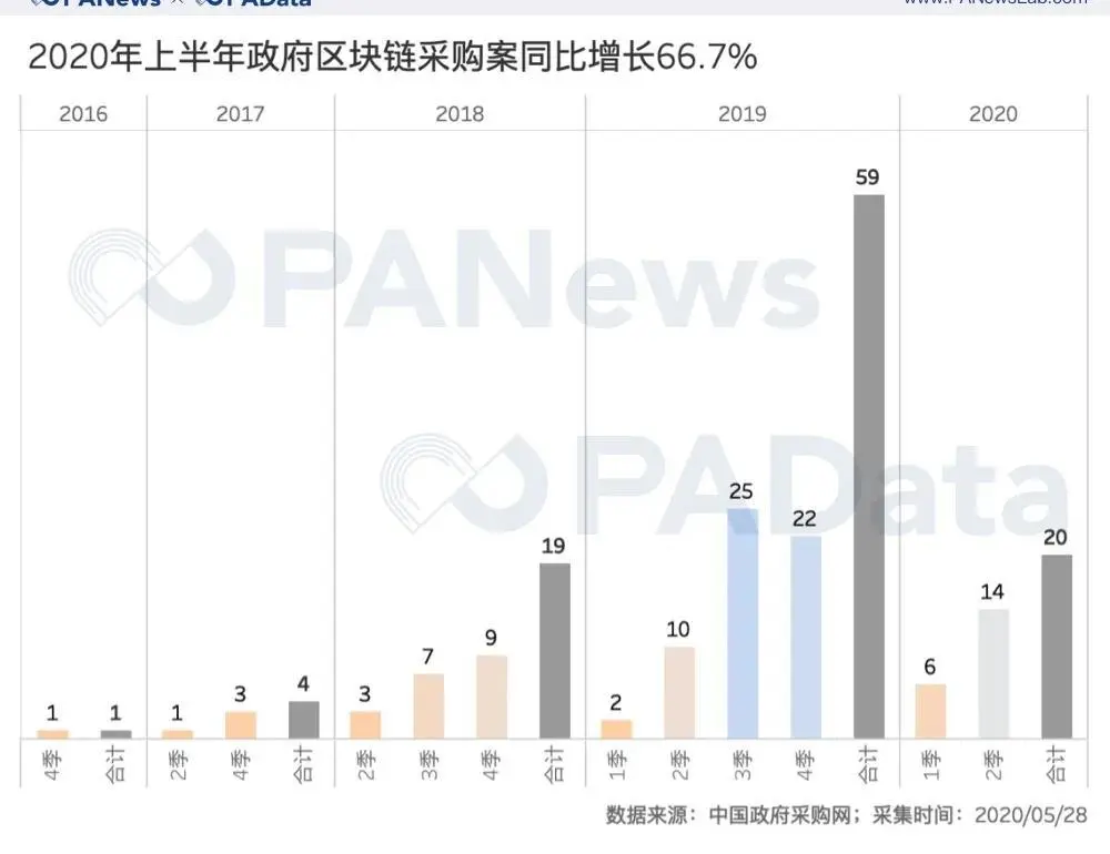 自去年高层强调推动区块链创新以来,中国21省市将区块链纳入政府工作报告,采购案激增,涉及教育科研、政务信息等场景,2020年上半年采购案同比增长67%。