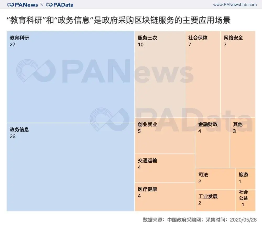 教育科研类的采购案主要是由学校发起用以购买实训平台或实验设备或由政府规划部门发起用以研究区块链产业发展。政务信息类的采购案主要是由政府部门或直属事业单位采购政务信息上链或政务治理信息化服务,其中不乏中央/省部级单位,比如国家市场监督管理总局和最高人民检察院检察技术信息研究中心等单位。