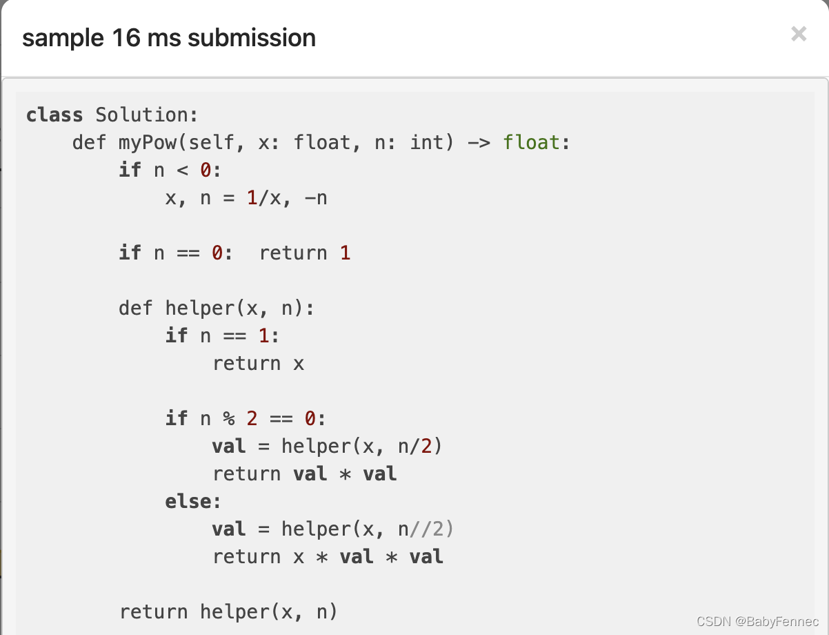 A:我用的是brute force。Time complexity是O(n), x 乘了n次,所以慢。helper就把相乘的次数直接减半。所以time complexity是O(log n)。
