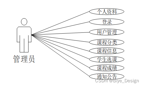 系统中的核心用户是系统管理员,管理员登录后,通过管理员菜单来管理后台系统。主要功能有:首页、个人资料、用户管理、课程分类、课程信息、学生选课、课程成绩、通知公告等功能。管理员用例如图3-7所示。