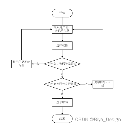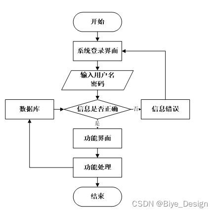 用户打开并进入系统后,会先显示登录界面,输入正确的用户名和密码,系统自动检测信息,若信息无误,则用户会进入系统功能界面,进行操作,否则会提示错误无法登录,操作流程如图3-3所示。