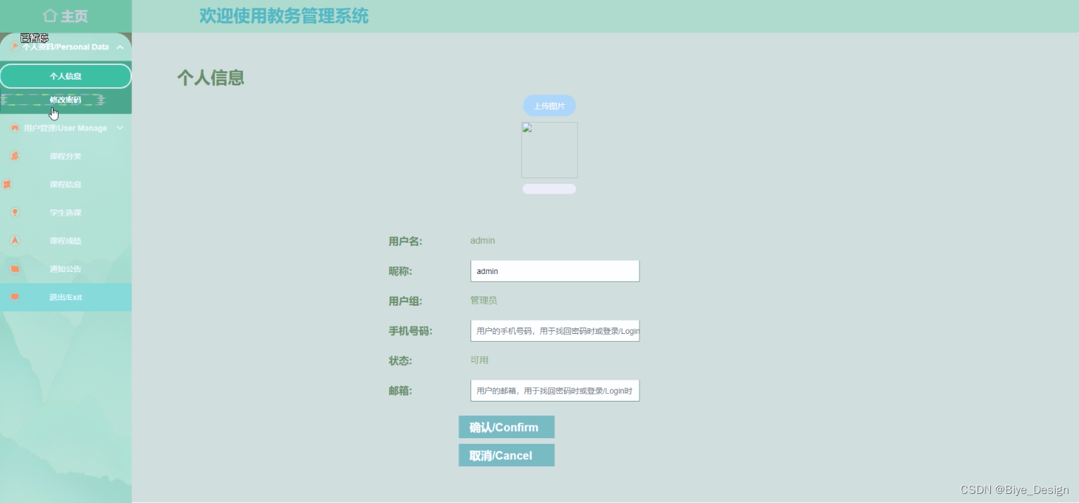 管理员和学生、教师点击“个人信息”按钮,可以对个人的头像、昵称、手机号码等信息进行更新;